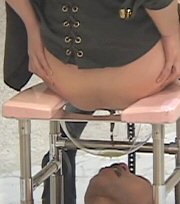 28.12.13 Video (32 min) - empfangsbereit liegt der gefesselte Sklave unter dem Toilettenstuhl, der Mund wird von einem Mundspreizer offen gehalten. Gleich wird sich seine Herrin niederlassen und ihr Geschäft verrichten und den Mund füllen. Als der Sklave beim Kauen und Schlucken etwas langsam ist, hilft die Herrin mit der Peitsche nach. |